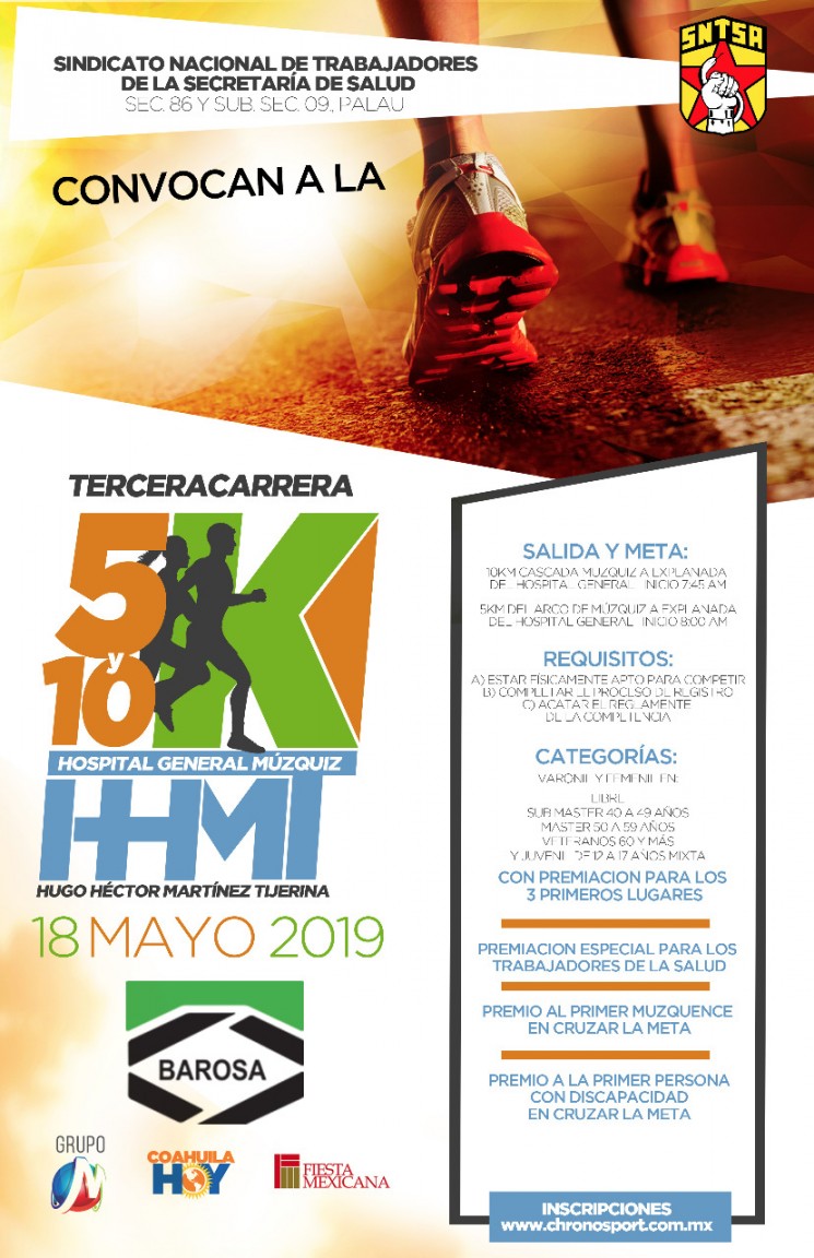24 Abr 3 Carrera Hugo Héctor Martínez Tijerina 18 Mayo Se invita a la gran 3 carrera anual HHMT (Hugo Héctor Martínez Tijerina) que organiza el Hospital General de Múzquiz año con año,la cita es este próximo 18 de Mayo de 2019, únase a este gran evento y hospedese con nosotros. Para mas información visite el sitio web oficial: http.//www.carrerahmmt.com